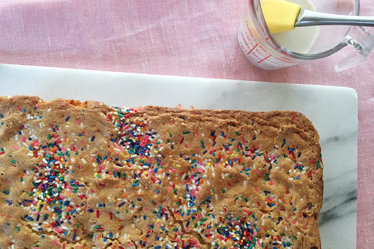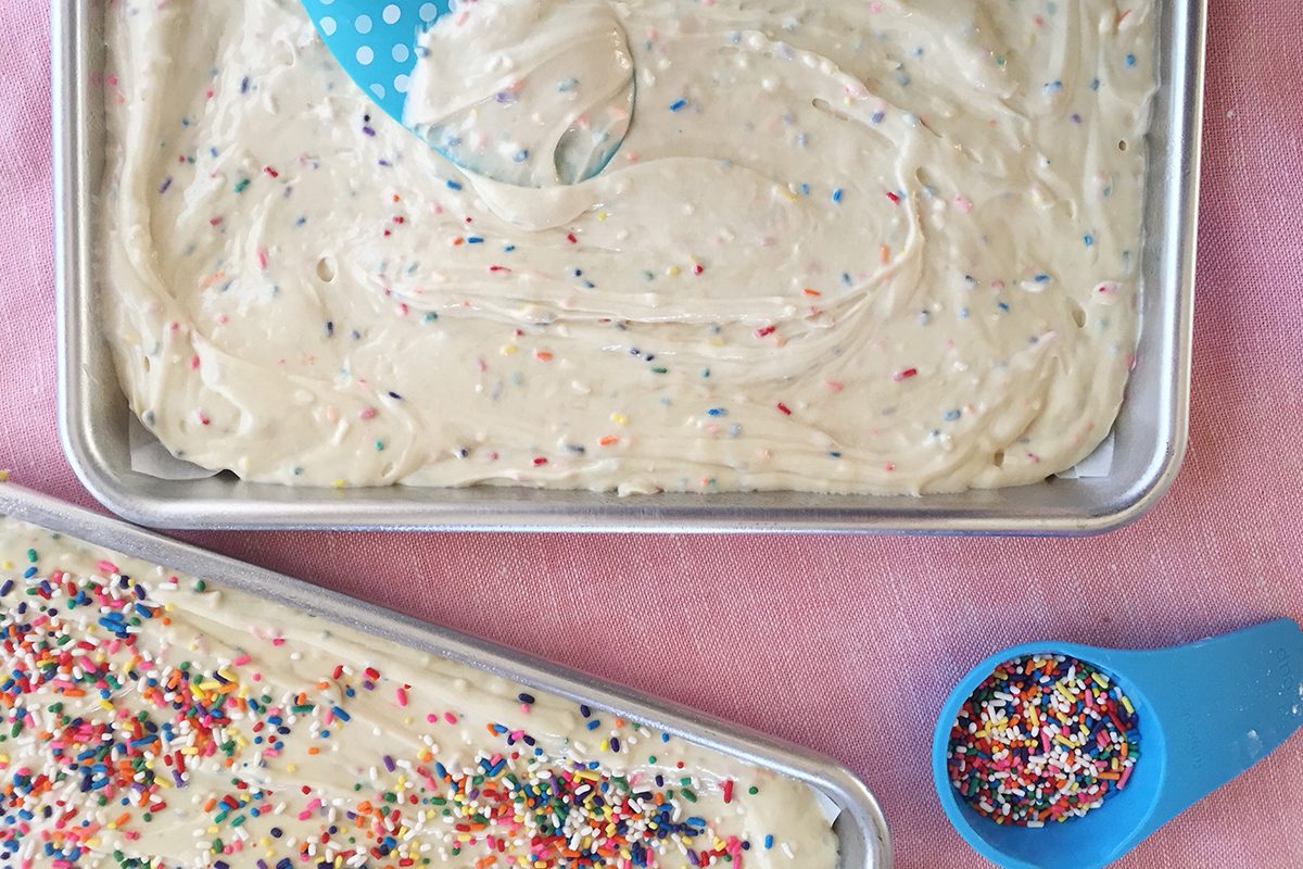 To do so, divide the batter evenly between two quarter-size sheet pans (that’s about 13×9″) sprayed with cooking spray and lined with parchment paper—I used our Test Kitchen’s favorite Nordic Ware pans. Use a spatula to spread the batter evenly, then top with the remaining quarter cup of sprinkles. Pop these in the oven for 30-35 minutes at 350ºF. When they’re ready, they should spring back slightly when touched.