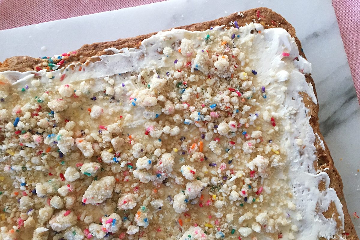 Looking at this recipe, it seems sort of daunting. Most sheet cakes are fairly simple, though crowd-pleasing. This one, on the other hand, consists of four different components. However, knowing Christina’s reputation for irresistible treats and next-level baking, I was confident that the combination of cake, frosting, crumbs and milk would make this a cake not to be missed. As Christina writes in her book All About Cake, this birthday sheet cake is the most popular at her bakeries: “People love to eat birthday-flavored cake when celebrating things, even when there’s not a birthday to honor in the room.”