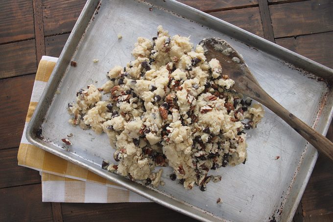 Then switch to a spatula or a wooden spoon and stir in the flour and salt until it comes together in a dough. Then just stir in your chocolate chips and toasted pecans. And yes, be sure to toast the nuts—it makes a big difference in flavor!