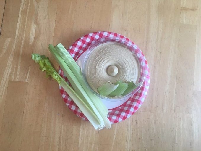 I like to munch on snacks with my two-year-old throughout the day. I usually have a cookie—or cheese and crackers—but since both of those are off-limits when you ditch gluten, I opted for apple slices with peanut butter and celery dipped in hummus for most of the days.