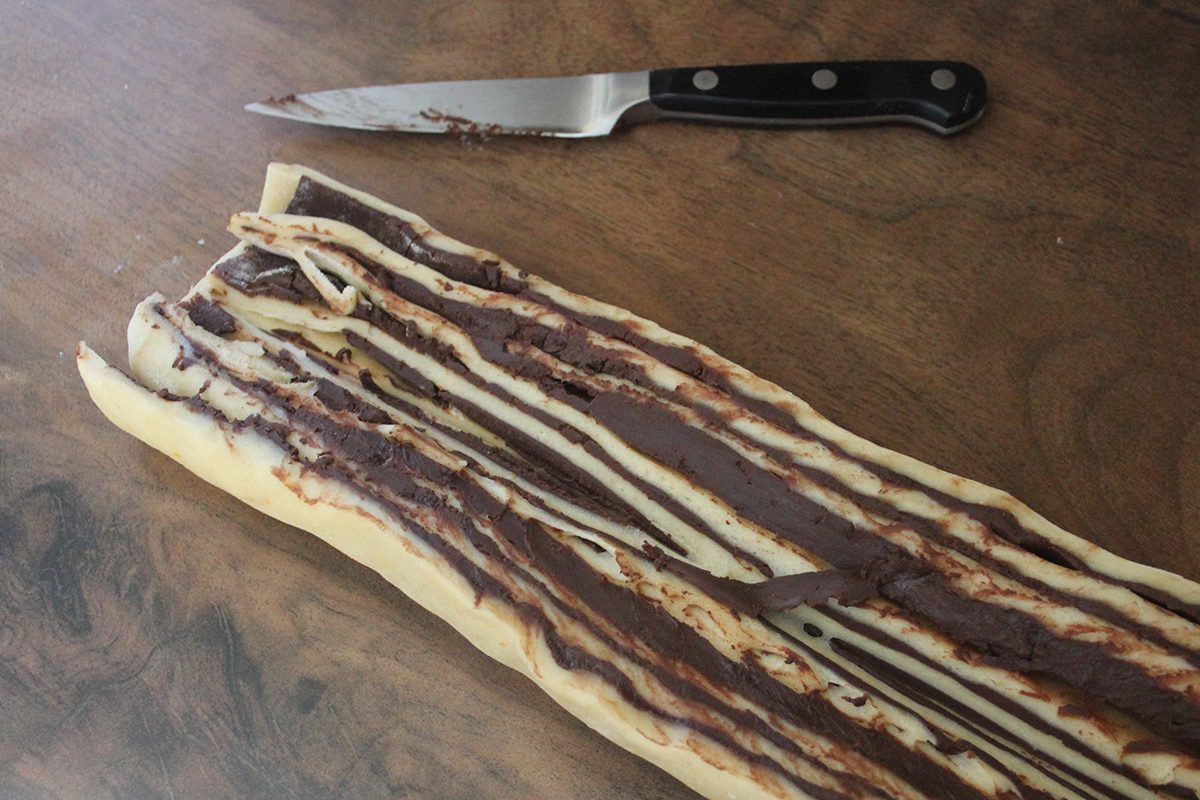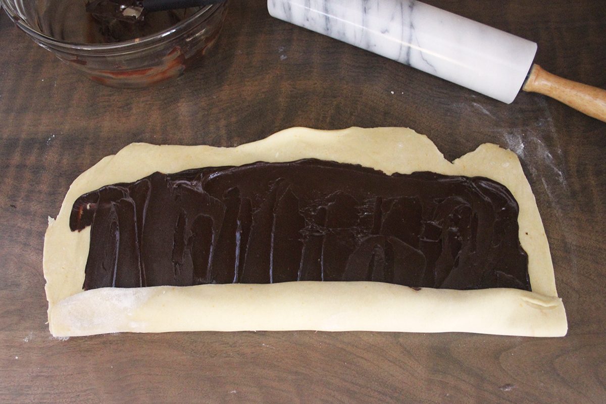 Roll out your dough to a rectangle approximately 10 inches by 12 inches. The dough should be fairly thin but not translucent. Then spread half the chocolate filling across the dough leaving a half-inch border. Then roll up the dough tightly starting at one of the 12-inch sides. Seal the roll with a bit of water. This technique is pretty similar to making a potica—another Eastern European favorite.