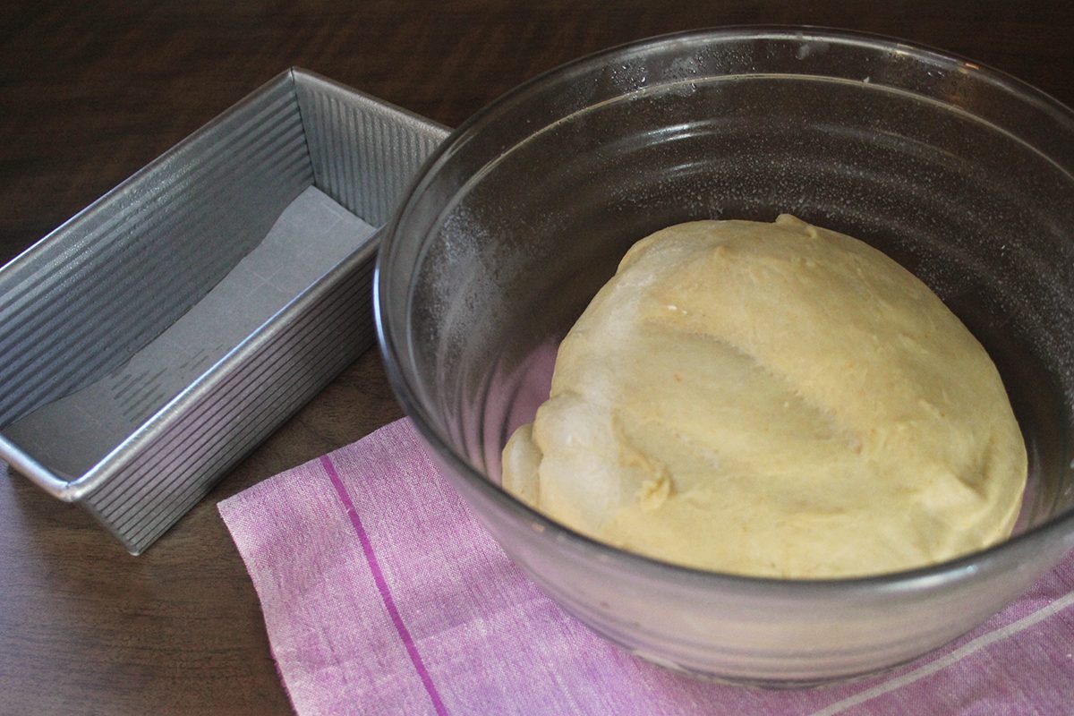 Then, with the filling sides up, twist the pieces together like a rope. Place into the bottom of a 9×4″ loaf pan that’s been greased and lined with parchment on the bottom. You can fiddle with it a bit so the bread fills the pan more evenly. It should look like a rope or twist. Repeat the process with the second loaf and allow them to rise again for about an hour and 45 minutes at room temperature. Cover them with a damp tea towel so they don’t dry out.