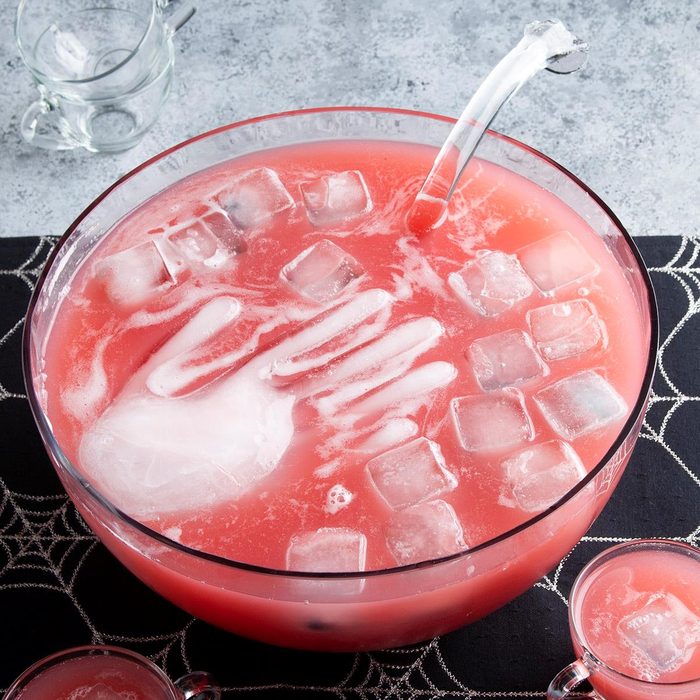 Want to scare up a good time at your Halloween party? This vibrant punch uses cranberry juice and blood orange soda to get its signature color. If you’re hosting adults only at your haunted mansion, add a splash of vodka to this mix.
