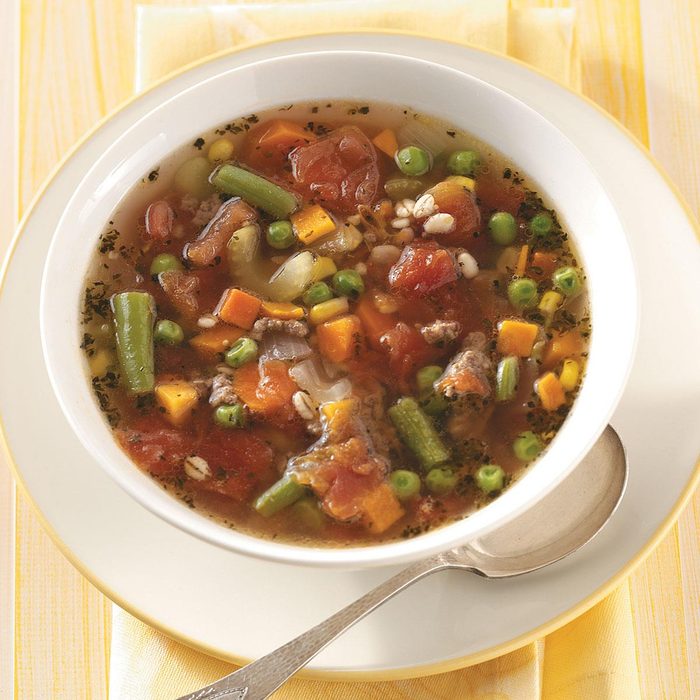 My mom picked up this barley soup recipe in her fitness class and passed it to me. It’s loaded with goodness! Sometimes, I substitute ground turkey as the meat and use chicken bouillon instead of beef flavored.—Emily Melton, Prophetstown, Illinois