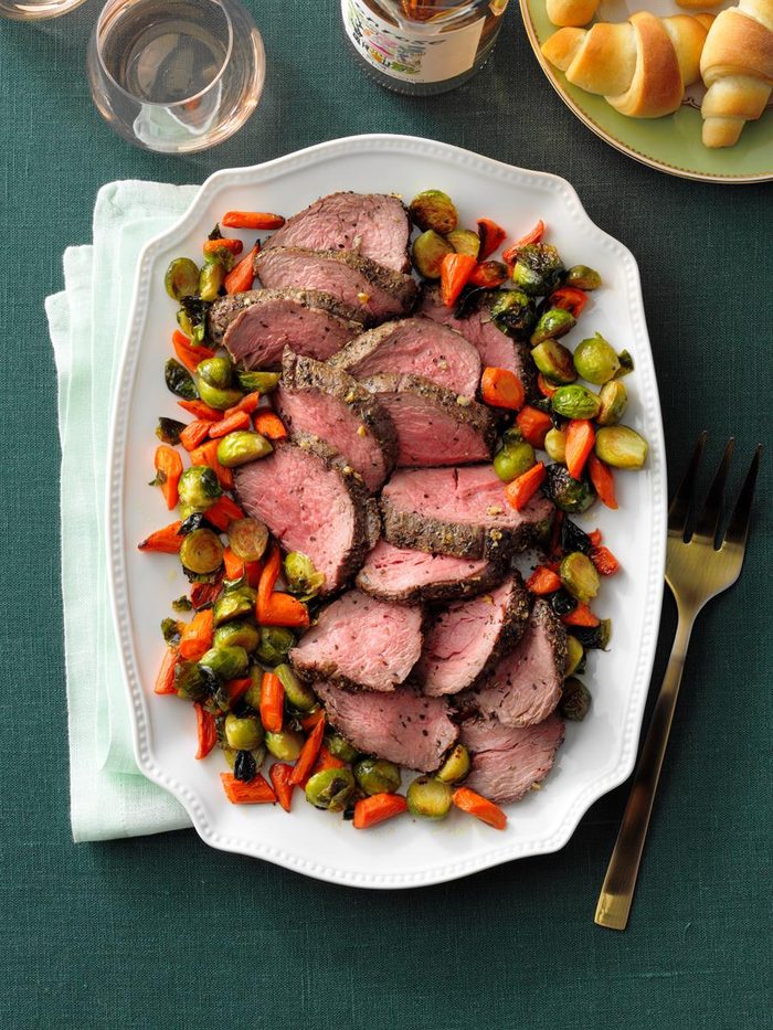 Cranberry sauce, honey, orange zest, cloves and nutmeg come together for a tangy and colorful glaze that makes the meal extra-special. While it might be tempting to slice into the roast as soon as it’s done, make sure to let it rest for 10 minutes for maximum tenderness.