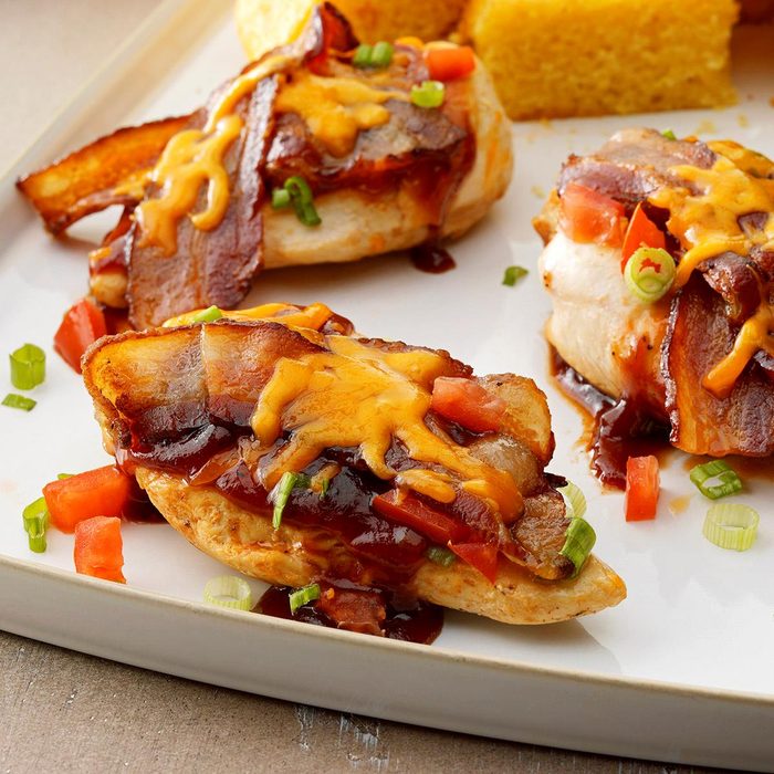 This Monterey chicken transforms regular chicken into a savory dish with barbecue sauce, crisp bacon and melty cheese. It gets even better with a sprinkling of fresh tomatoes and green onions. —Linda Coleman, Cedar Rapids, Iowa