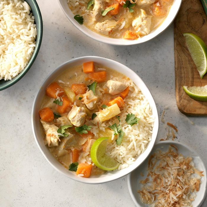 This stew tastes as if you spent hours in the kitchen. The flavors of coconut milk, sweet potato and coriander nicely complement the chicken. A garnish of cilantro and toasted coconut adds a bit of sophistication. —Nicole Filizetti, Stevens Point, Wisconsin