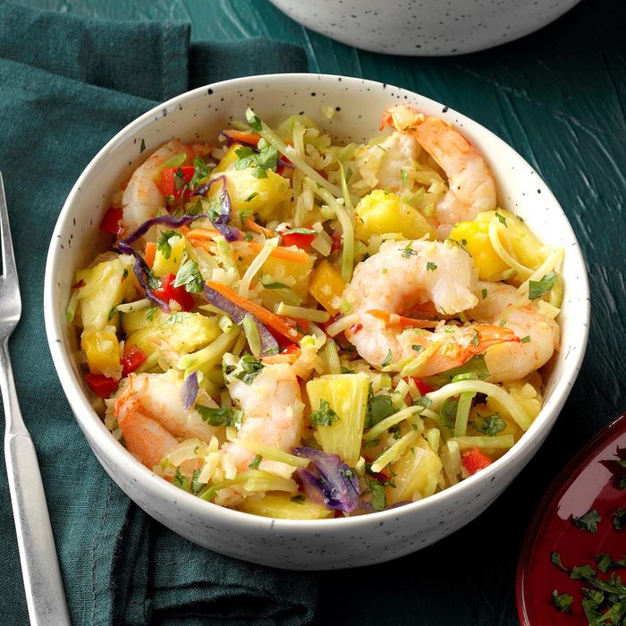 An easy way to plan gluten-free dinners? Make bowl meals, which are basically a grain plus protein plus a veggie, tied together with a tasty sauce. This island-inspired shrimp bowl is one of our favorites.