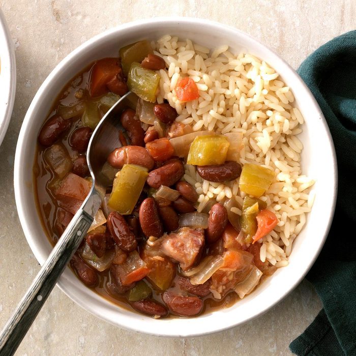 Smoked turkey sausage and red pepper flakes add zip to this saucy, slow-cooked version of Louisiana red beans and rice. For extra heat, add red pepper sauce at the table. —Julia Bushree, Georgetown, Texas
