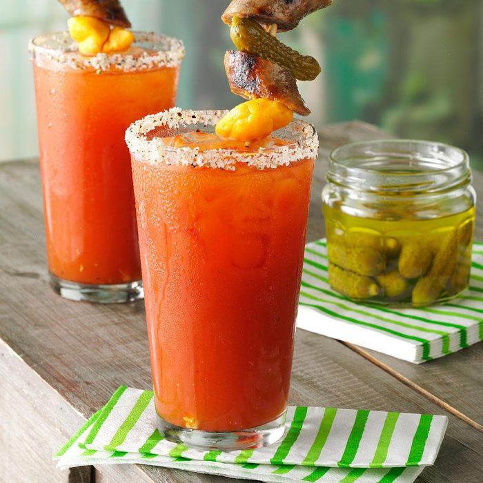 In the Midwest, Bloody Marys garnished with meats, cheeses and veggies are works of art. My beverage has skewers of bratwurst, cheese curds and dill pickles. —Kathryn Conrad, Milwaukee, Wisconsin