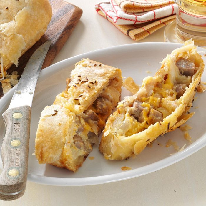 My husband, being born and raised in Wisconsin, loves bratwurst sausages. So I tweaked this strudel recipe to include some of his favorite filling ingredients and it was an instant hit. Serve with extra mustard for dipping. —Cleo Gonske, Redding, California
