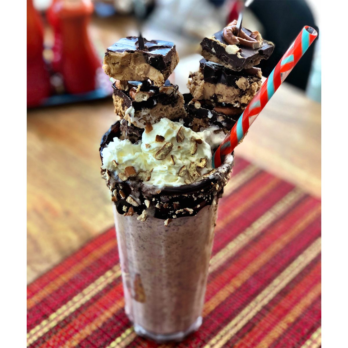 Loaded with breakfast-y goodness and enough caffeine to wake you up, this is a complete brunch to go! The shake is loaded with coffee ice cream, Irish cream and coffee liqueurs, a shot of espresso and a packet of hot chocolate mix…then decked out with whipped cream, mini pancakes, mini donuts, homemade hot fudge, cereal and bacon—with a drizzle of maple syrup to top it all off. A post-brunch nap is not included, but suggested!