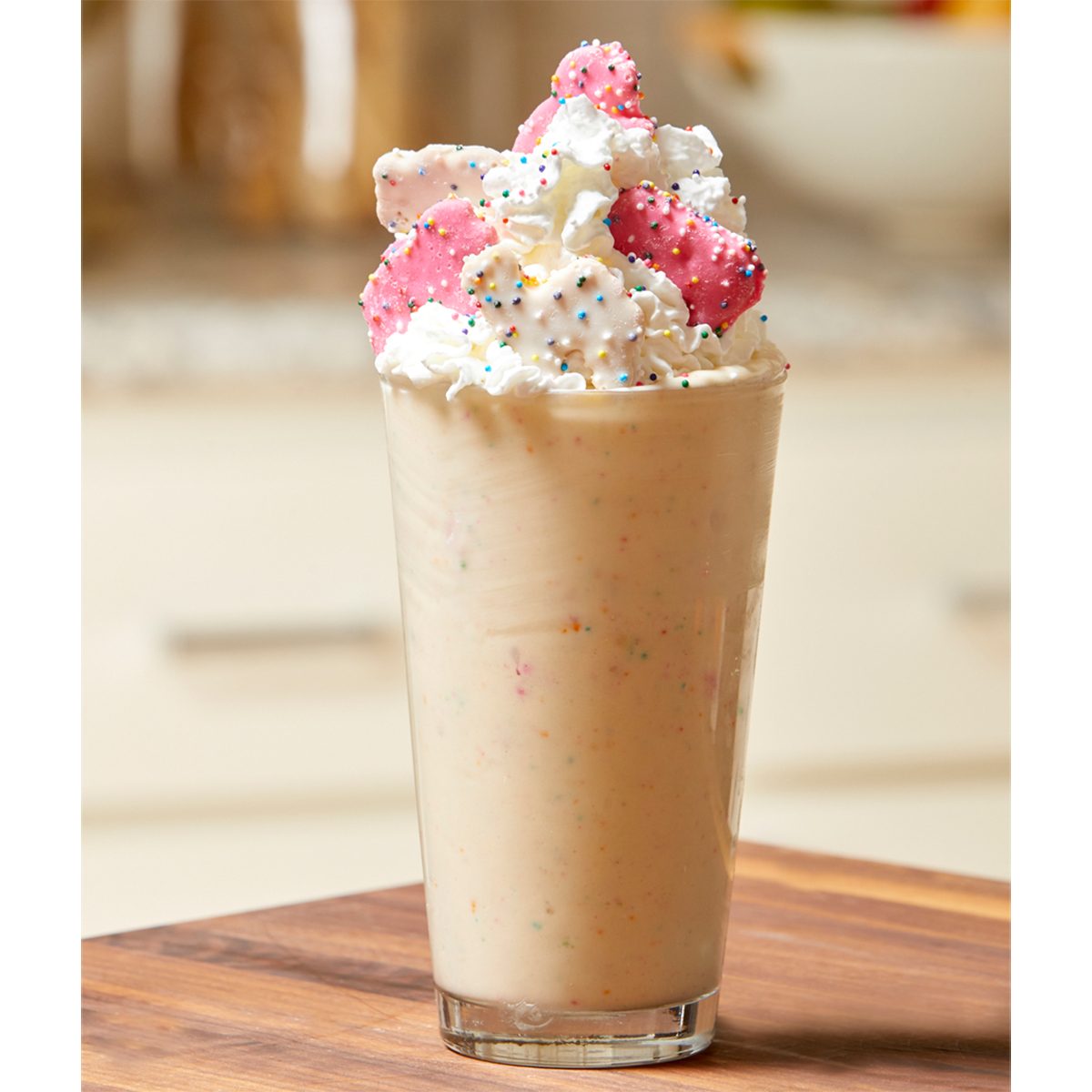 The Birthday Cake Shake is ice cream and cake and cookies all in one glass—a complete party in one deliciously cool indulgence! A relatively understated and elegant classic vanilla shake is stepped up with rainbow chip cake mix, frosted animal crackers and lashings of whipped cream. Here are 10 more wild ways to use animal crackers.