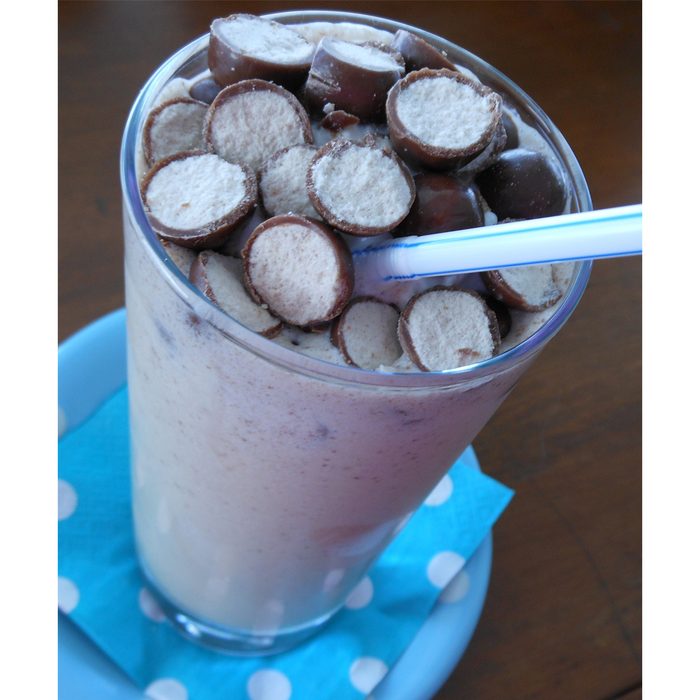 The classic combo of peanut butter and chocolate makes this an unforgettable treat. Start with a batch of Peanut Butter Pretzel Squares and then (if you can keep from eating them!) use them to crown a shake made of vanilla bean ice cream, chocolate sauce, low-fat milk (because you have to reduce the fat somewhere!), crushed mini pretzels and whipped cream. Before you begin, check out our guide on how to make a milkshake.