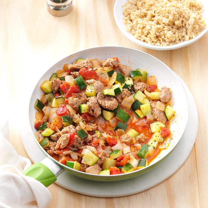 I began serving a version of this dish as a side with grilled salmon. I added sausage and rice—or noodles—to make a complete meal-in-one. —Debby Abel, Flat Rock, North Carolina