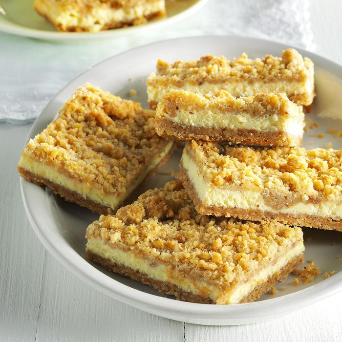 The streusel topping that comes with this recipe for apple cream cheese bars is absolutely irresistible. If you can’t resist a “taste test” before a party, just arrange each apple bar on a serving platter and no one will know a piece is missing from the pan! —Katherine White, Henderson, Nevada