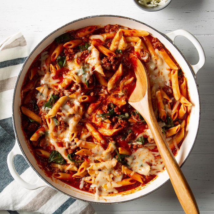 From the Recipe Creator: This hearty penne beef recipe is comfort food at its finest! The best of everything is found here—it’s tasty, easy and a smart way to sneak in some spinach for extra nutrition. —Taste of Home Test Kitchen
