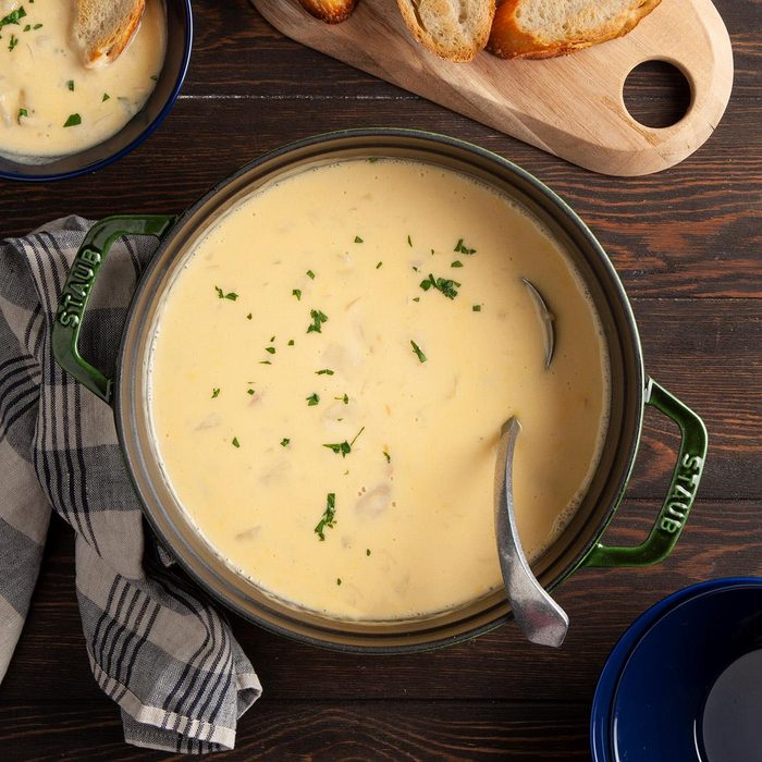 From the Recipe Creator: It doesn’t take long to put bowls of this comforting cheesy potato soup recipe on the table. Convenience items, such as canned soup and processed cheese, simplify the prep and make it easy to cook at a campsite. —Tammy Condit, League City, Texas