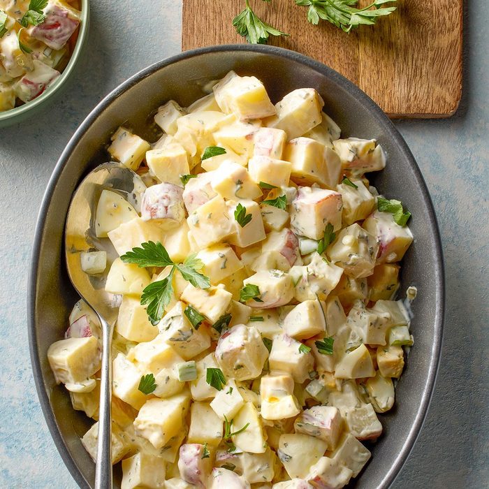 This flavorful red potato salad recipe with egg is the perfect side for summer cookouts. The red potatoes really dress it up. —Margaret Blomquist, Newfield, New York