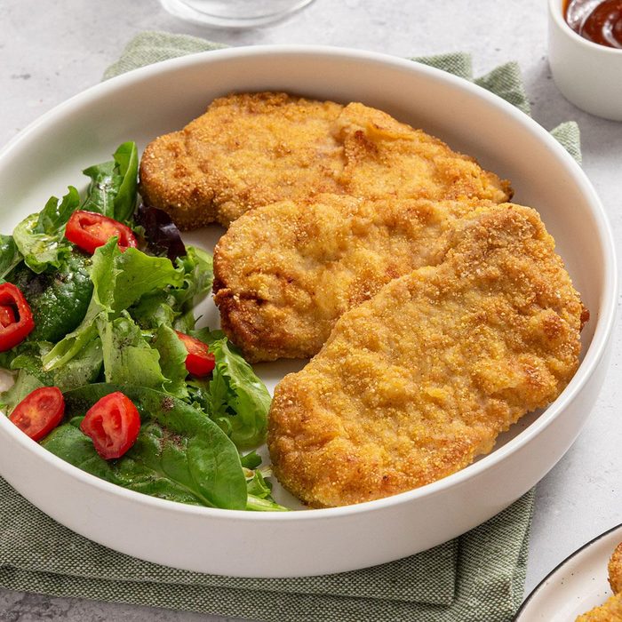 I make big fans whenever I serve this pork schnitzel recipe. German-style schnitzel is usually made with veal. I substituted pork to save money without sacrificing flavor. —Diane Katzmark, Metamora, Michigan