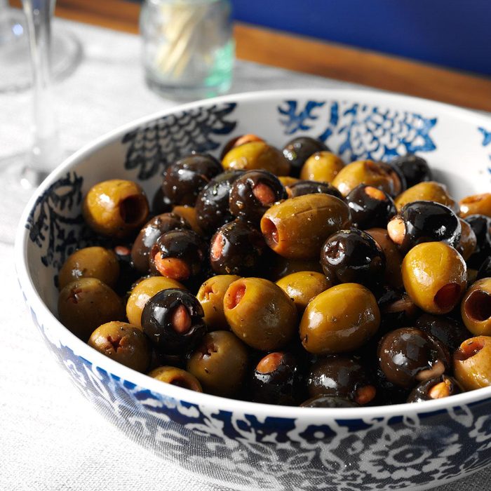 Marinated stuffed olives go over so well with company that I try to keep a batch of them in the fridge at all times. —Larissa Delk, Columbia, Tennessee