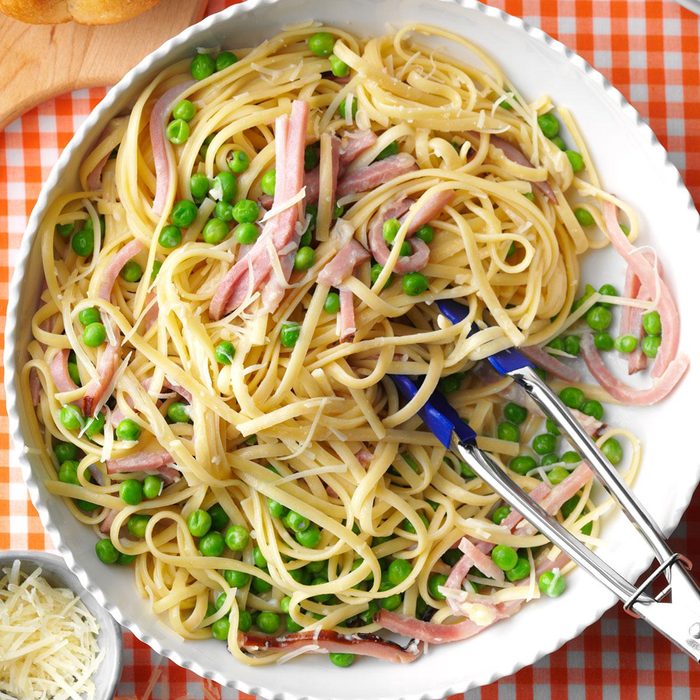From the Recipe Creator: I'm a busy nurse, so fast meals are a must. This pasta is a tasty change of pace from potato-ham casseroles. —Kathy Stephan, West Seneca, New York