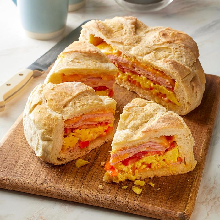 From the Recipe Creator: I love to make this mile-high breakfast sandwich when we have company for the weekend. If you'd like, add sliced mushrooms and olives. —Amy McCuan, Oakley, California