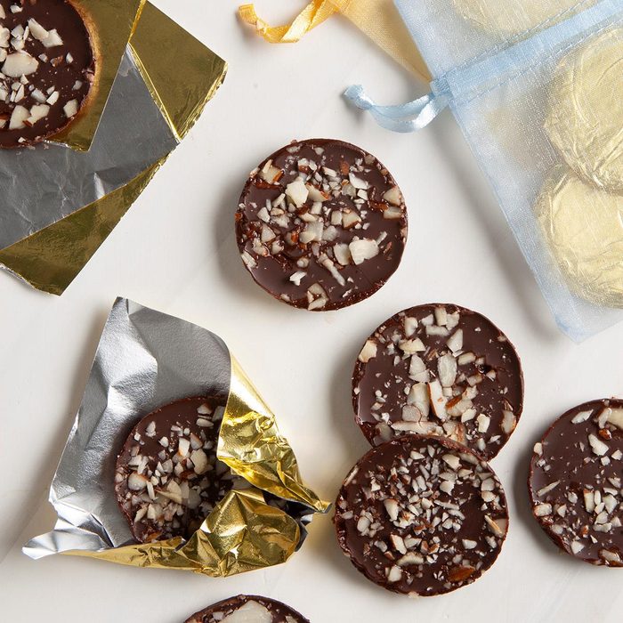 “Giving chocolate coins to children, and sometimes to teachers, is a long-standing Hanukkah tradition. This homemade version of gelt uses a miniature muffin pan to mold the coins into shape. The sliced almonds add a nice crunch, but the chocolates can be left plain or topped with other ingredients like sprinkles, crushed peppermint candies or finely chopped candied ginger.” —Taste of Home Test Kitchen