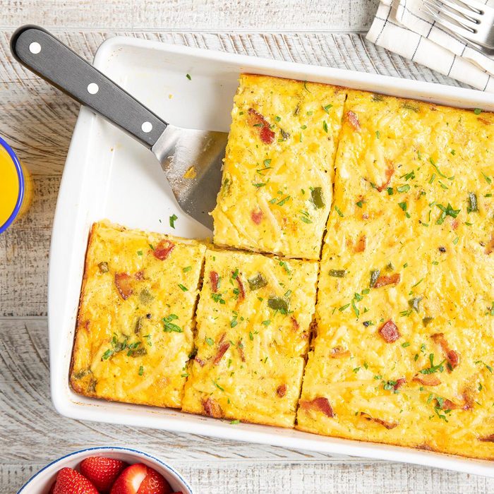 A package of frozen potatoes makes this hash brown egg casserole simple to prepare. Featuring bacon and cheddar cheese, this easy egg bake is tasty breakfast or brunch fare. You can even make it the night before, keep in the fridge and bake the next morning—so convenient! —Cheryl Johnson, Plymouth, Minnesota