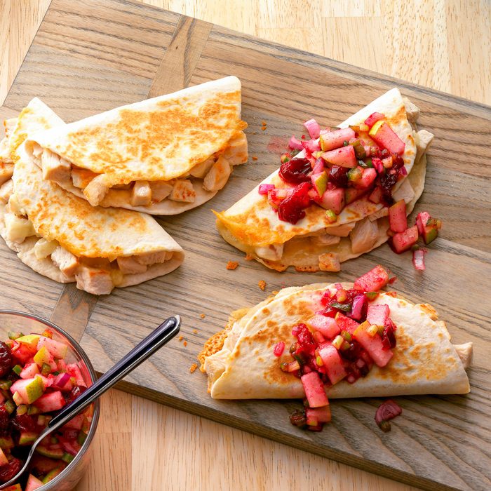 A sweet-tart cranberry salsa is the ideal accompaniment to leftover turkey in this breezy quesadilla. With a hint of lemon and pear, the salsa is also good with chicken or pork. —Jodi Kristensen, Macomb, Michigan