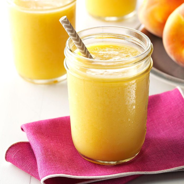 Whip up this creamy concoction as a refreshing and nutritious snack or a quick chilled breakfast. Because you can use frozen fruit, you don’t have to wait until peaches are in season to enjoy this delicious smoothie. —Martha Polasek, Markham, Texas