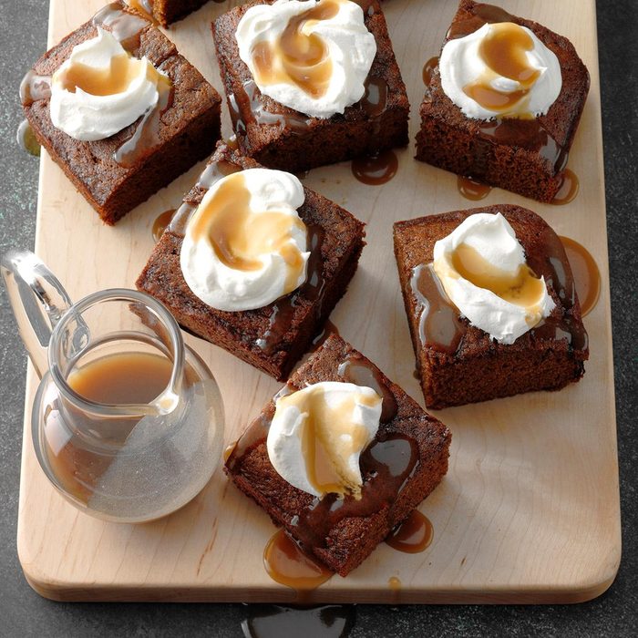 The rich molasses and spice flavor of this old-time dessert is complemented with a buttery caramel sauce. —Joy Sparks, Muskegon, Michigan