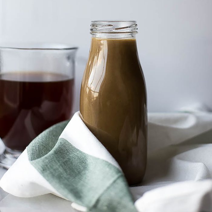 There’s so much to love about this dairy-free, Paleo-friendly coffee creamer from Saltnpepperhere. You basically make a rich and creamy almond milk before sweetening it up with maple syrup and hazelnut extract. It takes a few extra steps, but it’s totally worth it. (Psst! Here are a few of our other favorite healthy coffee creamers.)