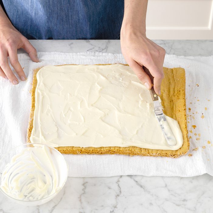 Once the cake has cooled completely, gently unroll it. Then spread the filling across the cake, leaving about a half an inch around the edge unfrosted (the filling will spread a bit as you roll). The easiest way to frost: an offset spatula—we use this type from Wilton.