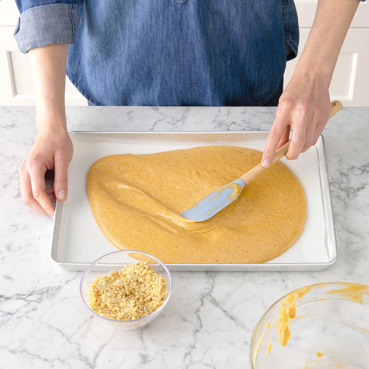 Then spread your batter into the pan. Sprinkle the batter with any toppings you prefer. We chose finely chopped walnuts that help give the recipe a little extra crunch. Then pop this into the oven to bake.
