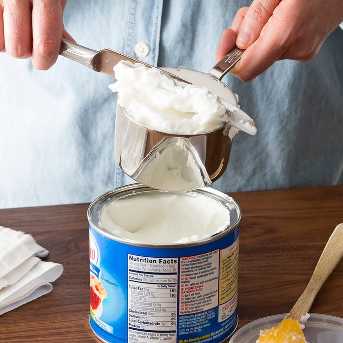 Press shortening into a dry measuring cup with a spatula to make sure it is solidly packed without air pockets. With a metal spatula or flat side of a knife, level with the rim. Some shortenings come in sticks and may be measured like butter.