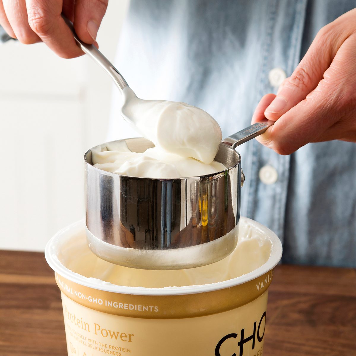 Spoon sour cream and yogurt into a dry measuring cup, then level the top by sweeping a metal spatula or flat side of a knife across the top of the cup.