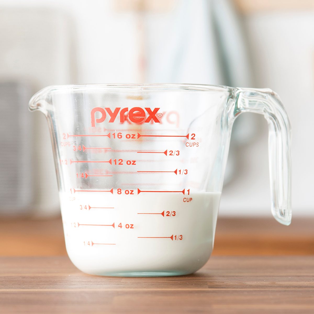 To measure liquid, place a liquid measuring cup on a level surface. View the amount at eye level to be sure of an accurate measure if using a traditional measuring cup. Do not lift cup to check the level. Some newer liquid measuring cups are made so that they can be accurately read from above.