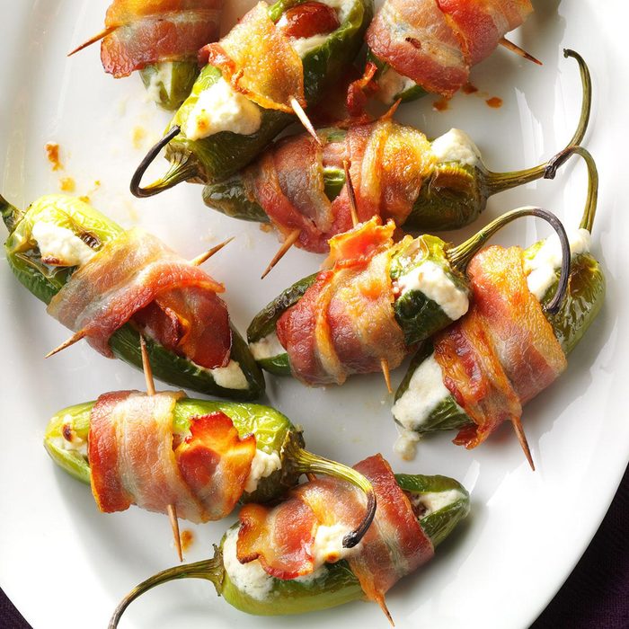 There’s no faster way to get a party started than with these bacon jalapeno poppers. Make them ahead and bake just before serving. Even the those who are intolerant of hot peppers will love them. —Dawn Onuffer, Crestview, Florida