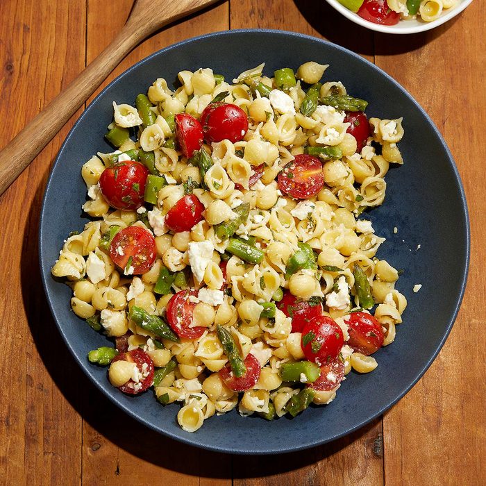 Straying from heavier, mayonnaise-based pasta salads, I created this lighter olive oil-based salad. Lemon juice, feta cheese, garlic and tomatoes brighten up this colorful and bright dish. —Laurie Sisco, Kingsley, Michigan