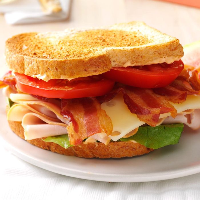 We’re crazy for turkey club sandwiches. A nearby roadside stand carries gorgeous tomatoes every summer. We load up, then stuff our sandwiches with the usual suspects, plus smoked turkey and cheese. —Pamela Shank, Parkersburg, West Virginia