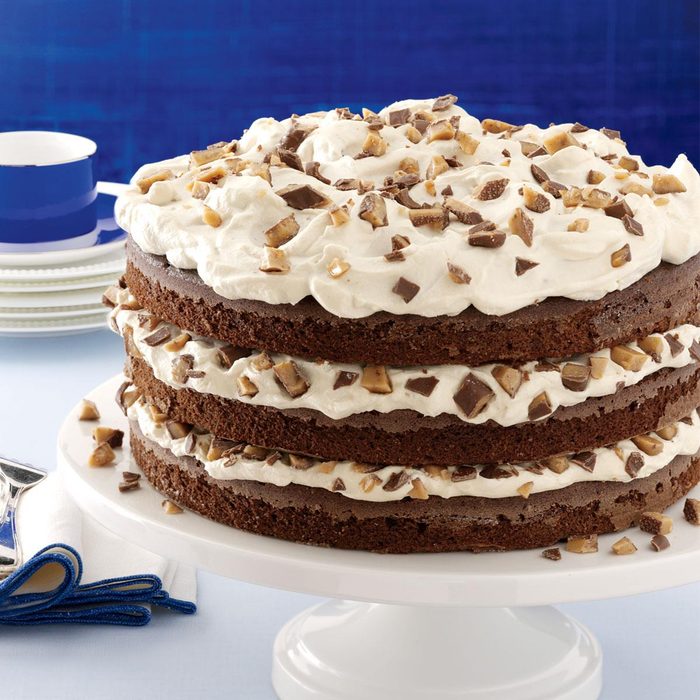 When you really want to impress someone, this scrumptious torte is just the thing to make! Instant coffee granules give the moist chocolate cake a mild mocha flavor, while the fluffy whipped cream layers, blended with brown sugar and crunchy toffee bits, are deliciously rich. —Lynn Rogers, Richfield, North Carolina