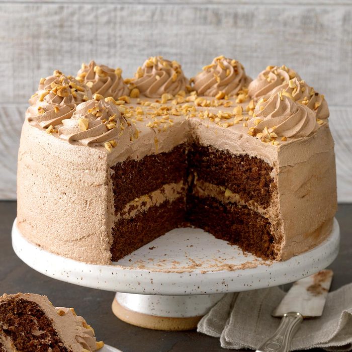 I make this cake on birthdays and other special occasions because it looks and tastes so amazing. The combination of mild hazelnut and coffee flavors is impossible to resist. —Christina Pope, Speedway, Indiana
