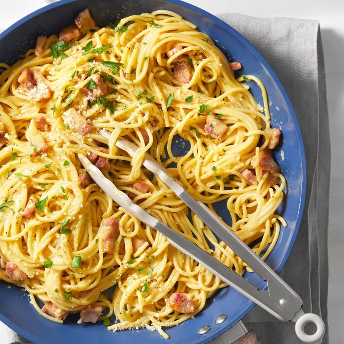 From the Recipe Creator: Spaghetti carbonara is a classic Italian recipe. The key is to use the hot pasta water to make the dish creamy. If made properly, there is no need to add cream or milk. The dish is luxurious, satisfying, comforting and easy to make. If you like, you can add peas after you have cooked the pancetta and garlic. Use any pasta you like, but the consistency is usually best with a thicker spaghetti. —Luisa Webb, Fort Collins, Colorado
