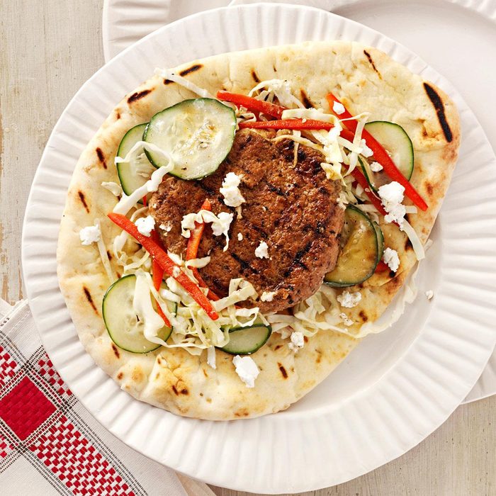Juicy turkey patties, crisp cabbage mix and creamy goat cheese combine in warm folded naan instead of in a bun. Flavored with Sriracha, honey, Dijon mustard and all your favorite veggies, these fusion burgers come together fast on the grill. It’s a weeknight dinner with weekend flavors.