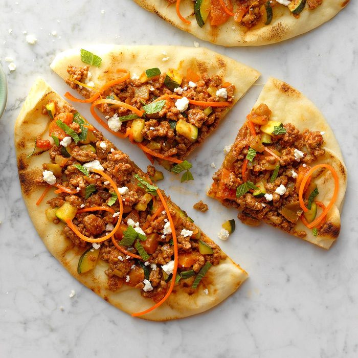 Mix up taco night with these Moroccan-inspired flatbreads. Simmering ground lamb with a Moroccan spice blend (aka ras el hanout), sweet dried apricots and a touch of lemon zest creates a sweet-and-savory mixture that’s bold but not overpowering. The pillowy naan makes the perfect base, soaking up every juicy bite—no fork needed. For a fun twist, try this non-traditional naan pairing with the sauce from our lamb pitas with yogurt sauce recipe.