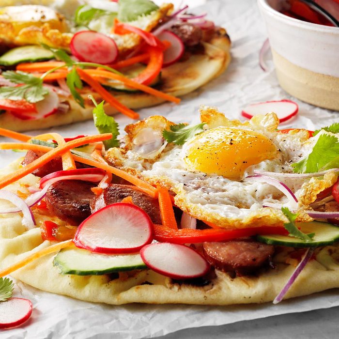 This colorful twist on the classic Vietnamese chicken banh mi uses warm naan instead of a baguette. The pickled veggies balance the richness of the smoky sausages, while the fresh herbs and cucumbers add crunch to every bite.