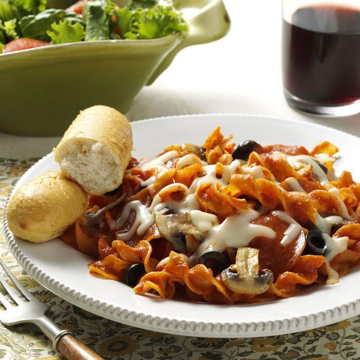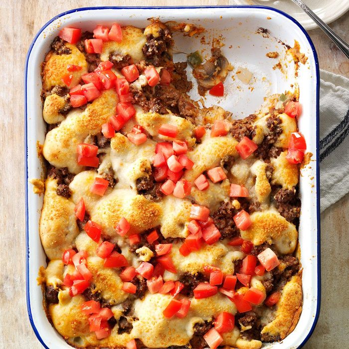From the Recipe Creator: I make this hearty casserole for the men who help us out during harvesttime. Every year they say it’s the best—hands down. Throw in any pizza toppings your family likes—Canadian bacon, black olives and green peppers are some of our picks. —Brook Bothun, Canby, Minnesota