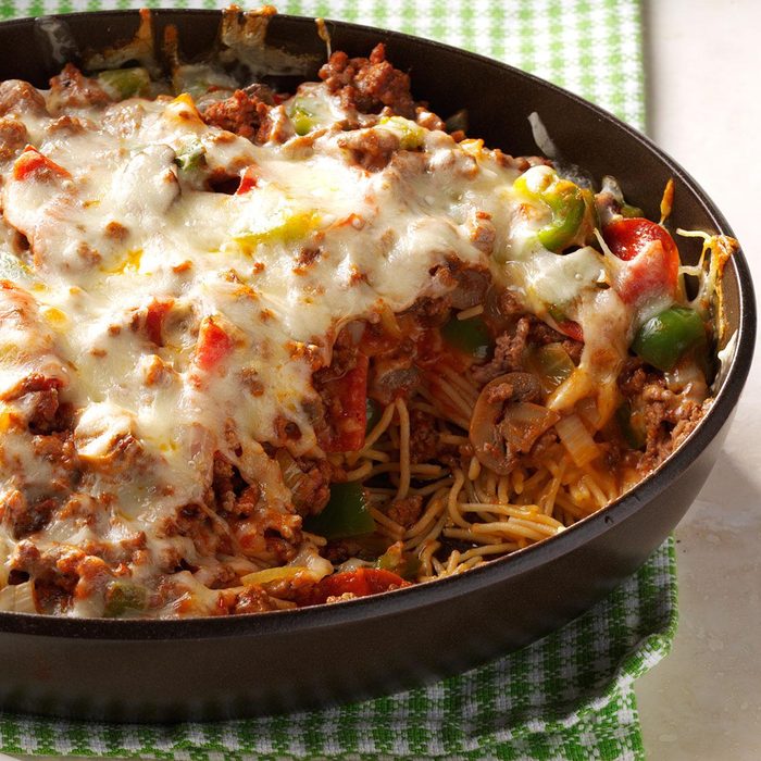 From the Recipe Creator: My family often requests this meatless main dish. It's a tempting cross between pizza and spaghetti. —Andrea Quick, Columbus, Ohio