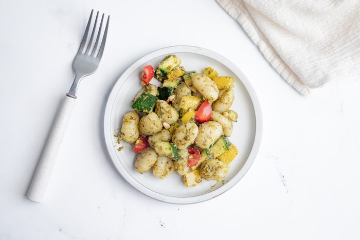 Perk up gnocchi and vegetables with a flavorful pesto sauce. If you don't have pine nuts to top the pesto gnocchi, skip or substitute any nut you like. —Taste of Home Test Kitchen